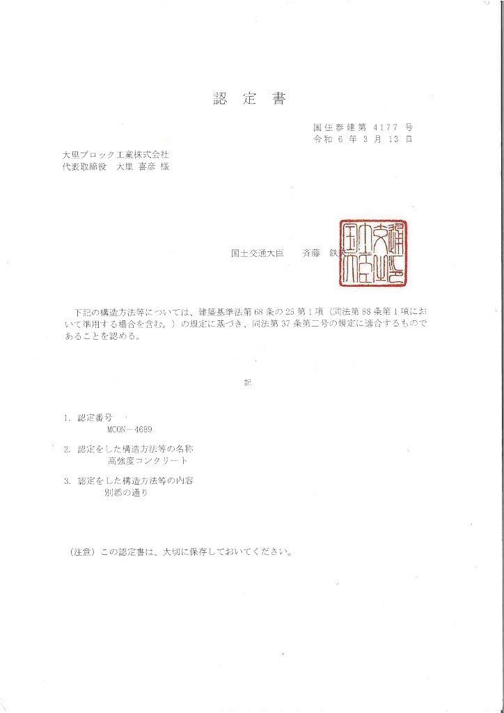 大里ブロック工業株式会社、令和6年3月、国土交通大臣より「高強度コンクリート」の認定工場認定
